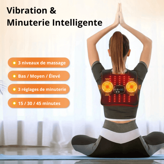 Soulagez vos douleurs avec cette ceinture chauffante dos et ventre. Sans fil, avec lumière rouge 660/850nm, massage par vibration, autonomie 5000mAh et minuterie, elle procure un confort optimal et une chaleur thérapeutique ciblée.