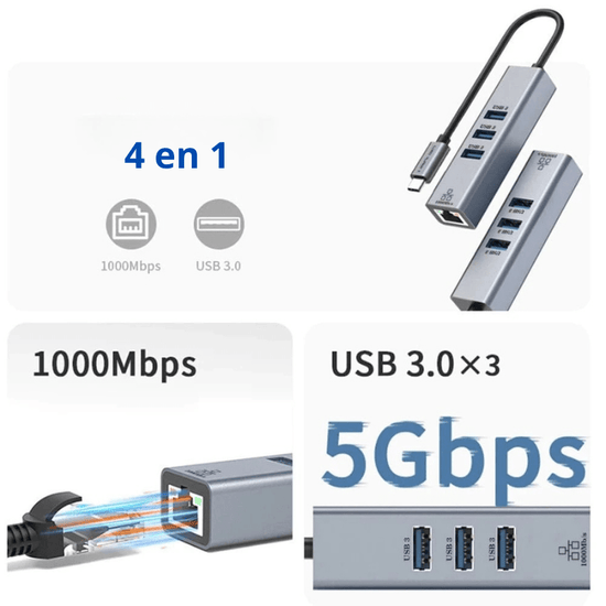 Optimisez la connectivité de votre ordinateur avec ce Hub USB-C Ethernet compact. Grâce à ses 3 ports USB 3.0 et son port RJ45 100 Mbps, vous bénéficiez d’une connexion rapide, stable et d’un transfert de données haute vitesse.