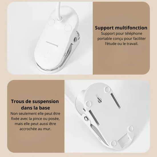Lampe de bureau à pince LED avec col de cygne flexible, batterie rechargeable intégrée, 3 niveaux de luminosité et port USB. Éclairage idéal pour la lecture et le travail.