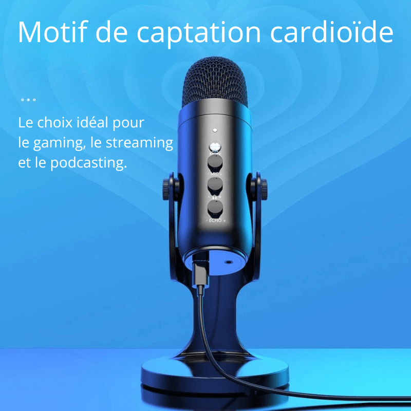 Microphone USB professionnel avec support de table, réduction de bruit intégrée et compatibilité PC, Mac, iPhone et iPad. Plug & Play avec contrôle du volume, de l’écho et fonction mute. Parfait pour les streams, réunions, podcasts et enregistrements.