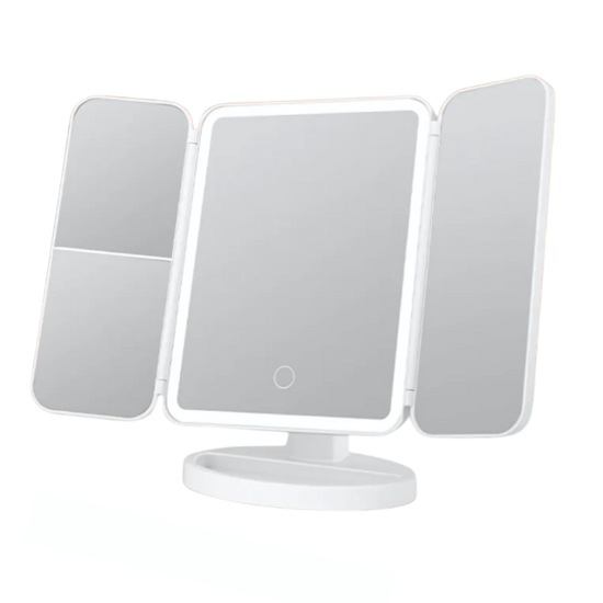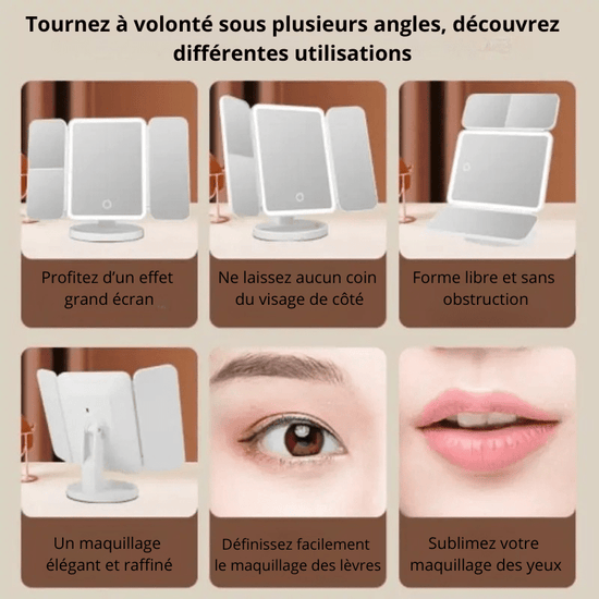 Miroir LED maquillage sur pied avec éclairage intégré, grossissements multiples, design pliable et base stable. Idéal pour une routine beauté précise et confortable.