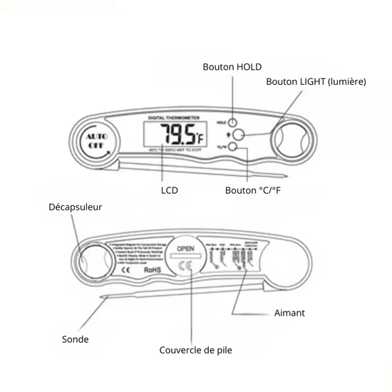 Thermomètre cuisine pro – Thermomètre digital pliable avec sonde inox ultra précise, affichage rétroéclairé, fonction alarme, idéal pour barbecue, four, viande et pâtisserie à température contrôlée.