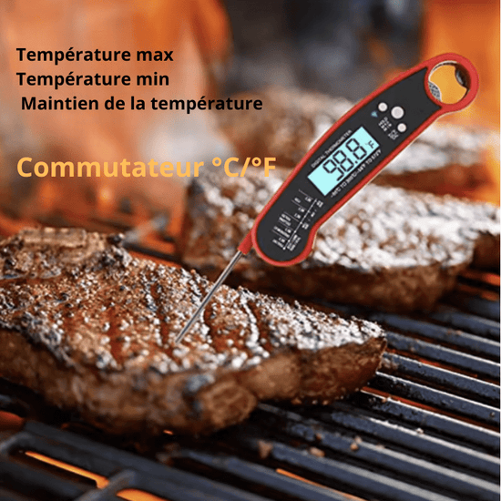 Thermomètre de cuisine digital ultra précis, idéal pour la cuisson de la viande, du poisson, des gâteaux ou du barbecue. Sonde pliable, lecture instantanée et large écran rétroéclairé.