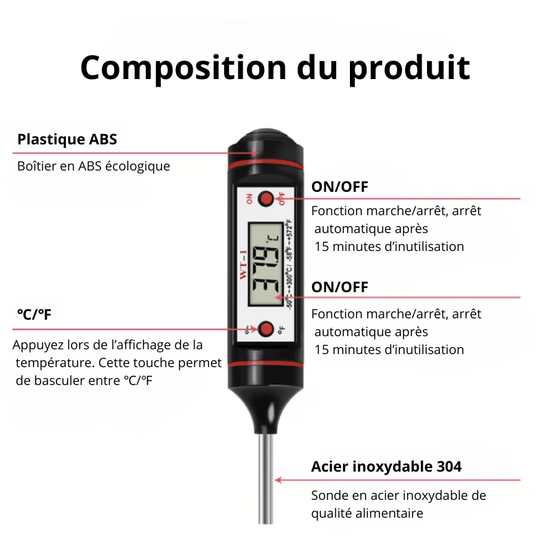 Thermomètre digital cuisine – Obtenez des mesures précises pour vos cuissons grâce à ce thermomètre digital à sonde. Parfait pour la viande, le four, le BBQ ou le fumoir, avec alarme et affichage LCD clair.