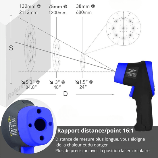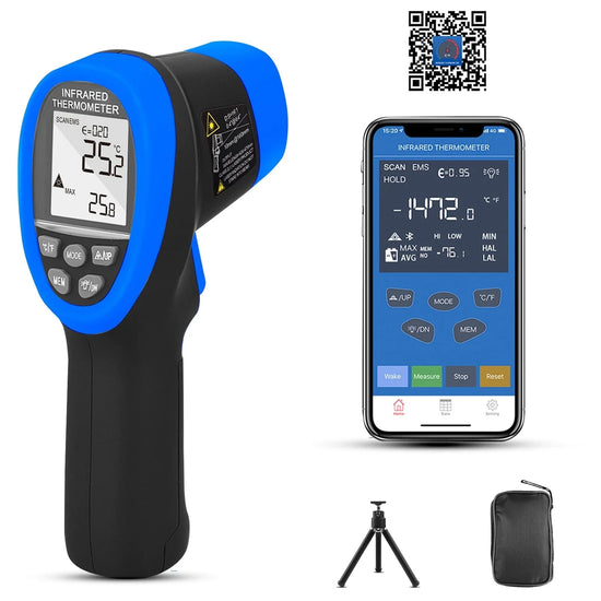 Thermomètre à infrarouge professionnel avec Bluetooth, idéal pour mesurer la température de fours, moteurs, équipements industriels ou BBQ, allant de -50°C à 800°C avec affichage instantané.