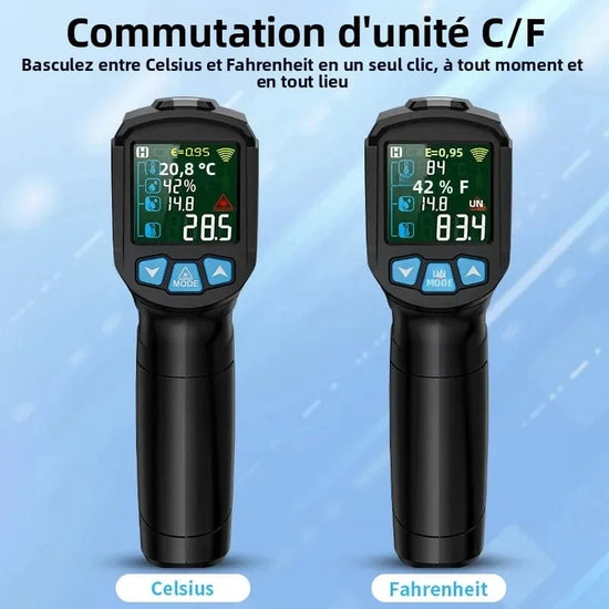 Mesurez avec précision la température de vos aliments ou de vos surfaces industrielles grâce à ce thermomètre infrarouge professionnel. Plage étendue de -50 à 800°C, écran LCD, sonde filaire incluse, et émissivité réglable pour une précision optimale.